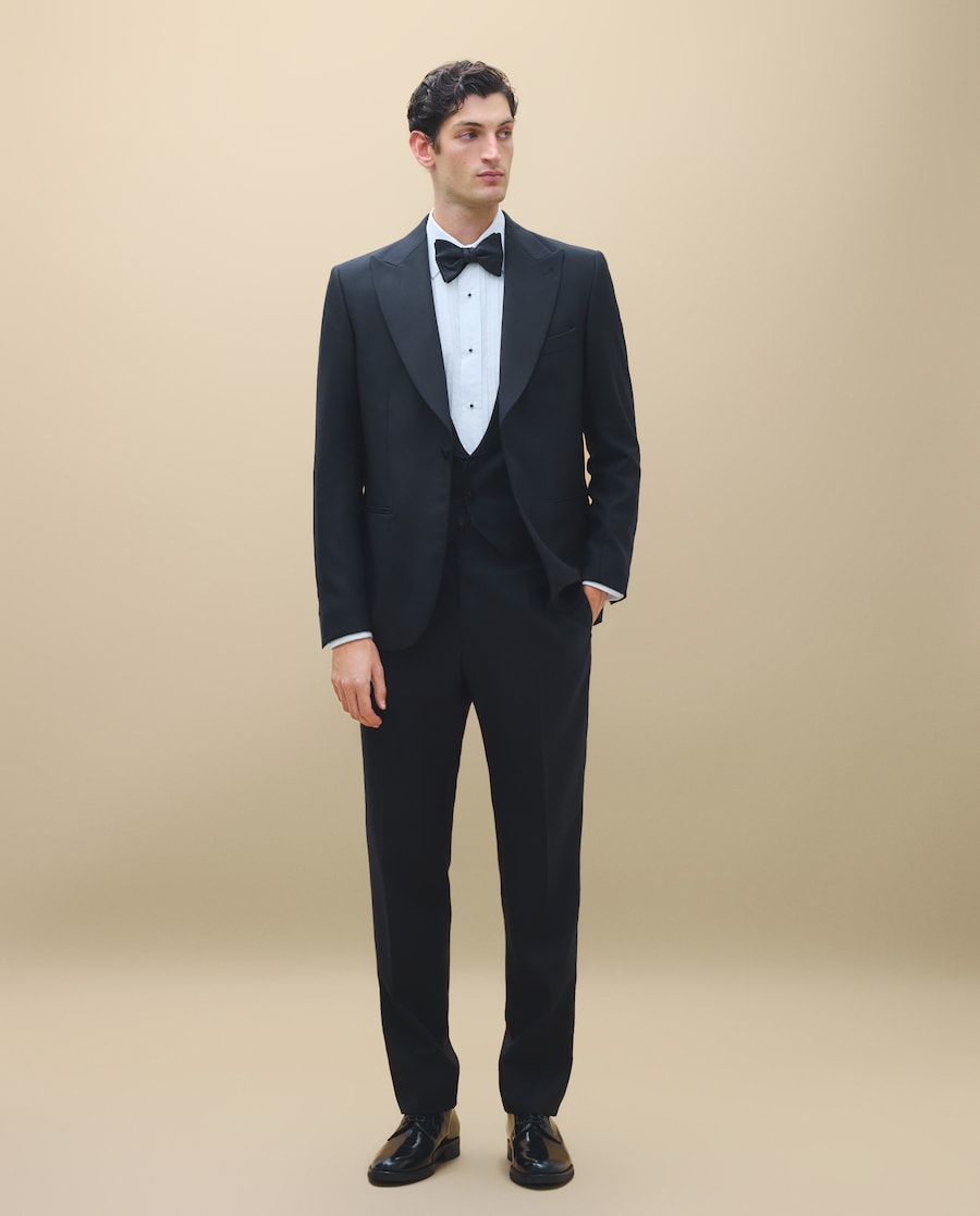 Smoking preto de cerimónia de três peças, gola em V de cetim otomano, um botão, duas aberturas, martelos abertos e botões forrados, colete de três botões com lapela em gola xale e calças sem pregas, com galões nas laterais, cintos e botões para suspensórios.