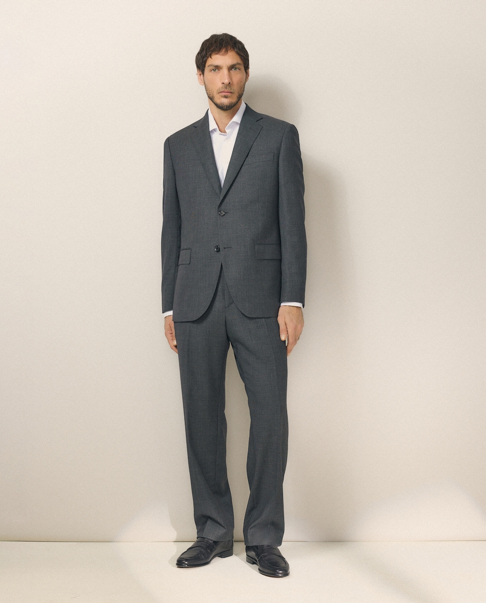 Estilo mais tradicional. Casaco direito e formal. Calças largas e elegantes.
