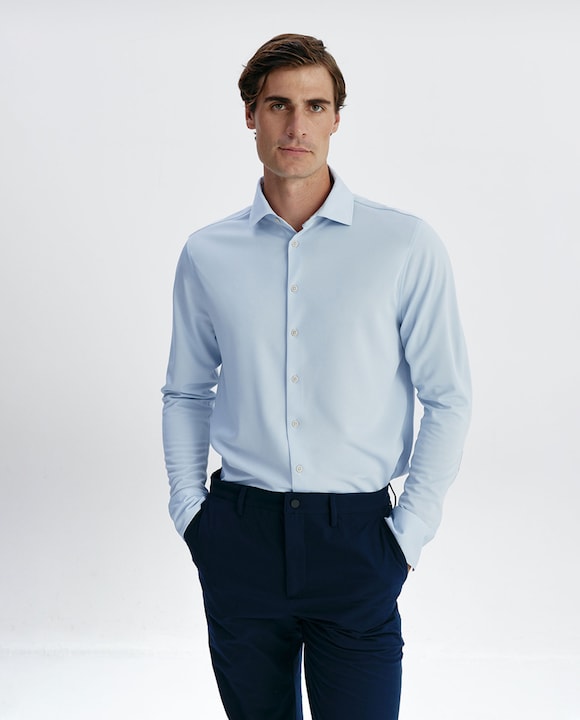 Relaxed fit estreito. Realça a figura, mantendo, ao mesmo tempo, o conforto. Gancho amplo, largura da manga que não restringe os movimentos.