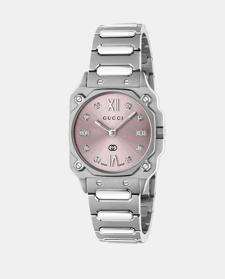 Relógio de quartzo com caixa em aço inoxidável, mostrador cor-de-rosa e bracelete em aço inoxidável.