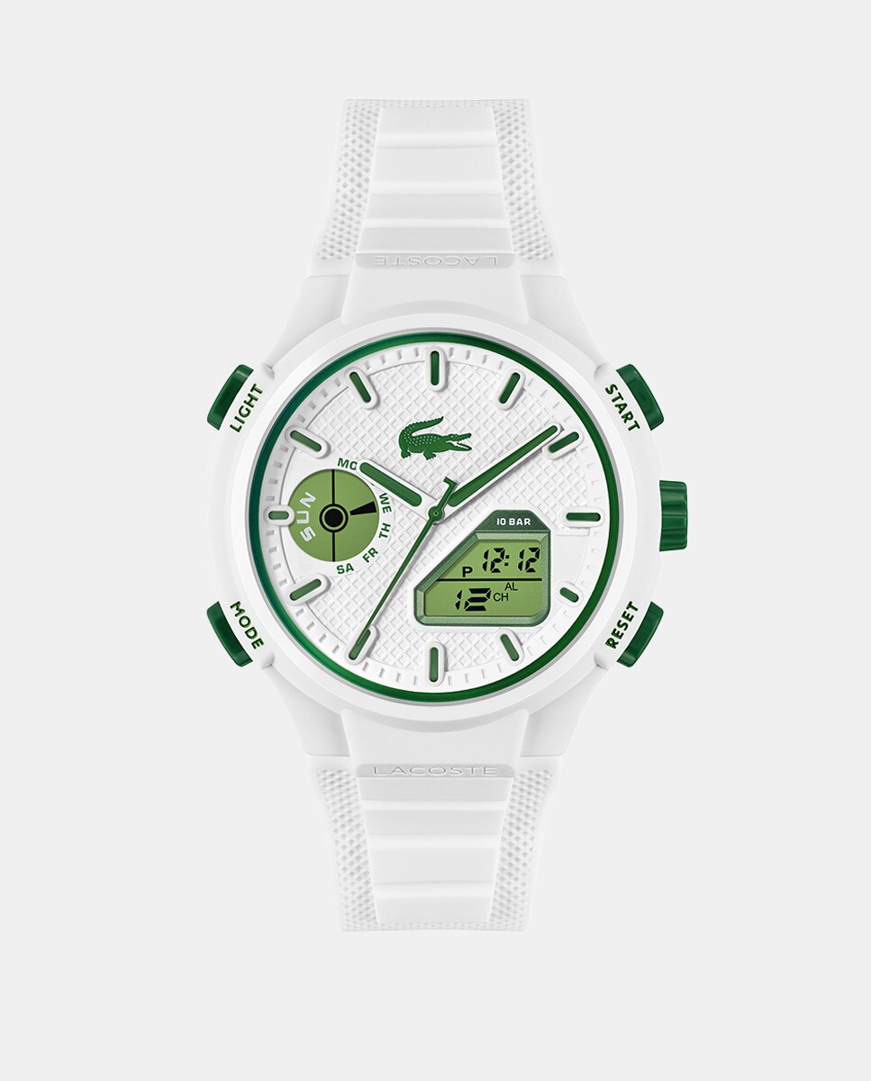 Relógio analógico e digital. Caixa TR90 branca de 45 mm. Mostrador branco com indicadores de barras verdes. Bracelete de silicone branca.