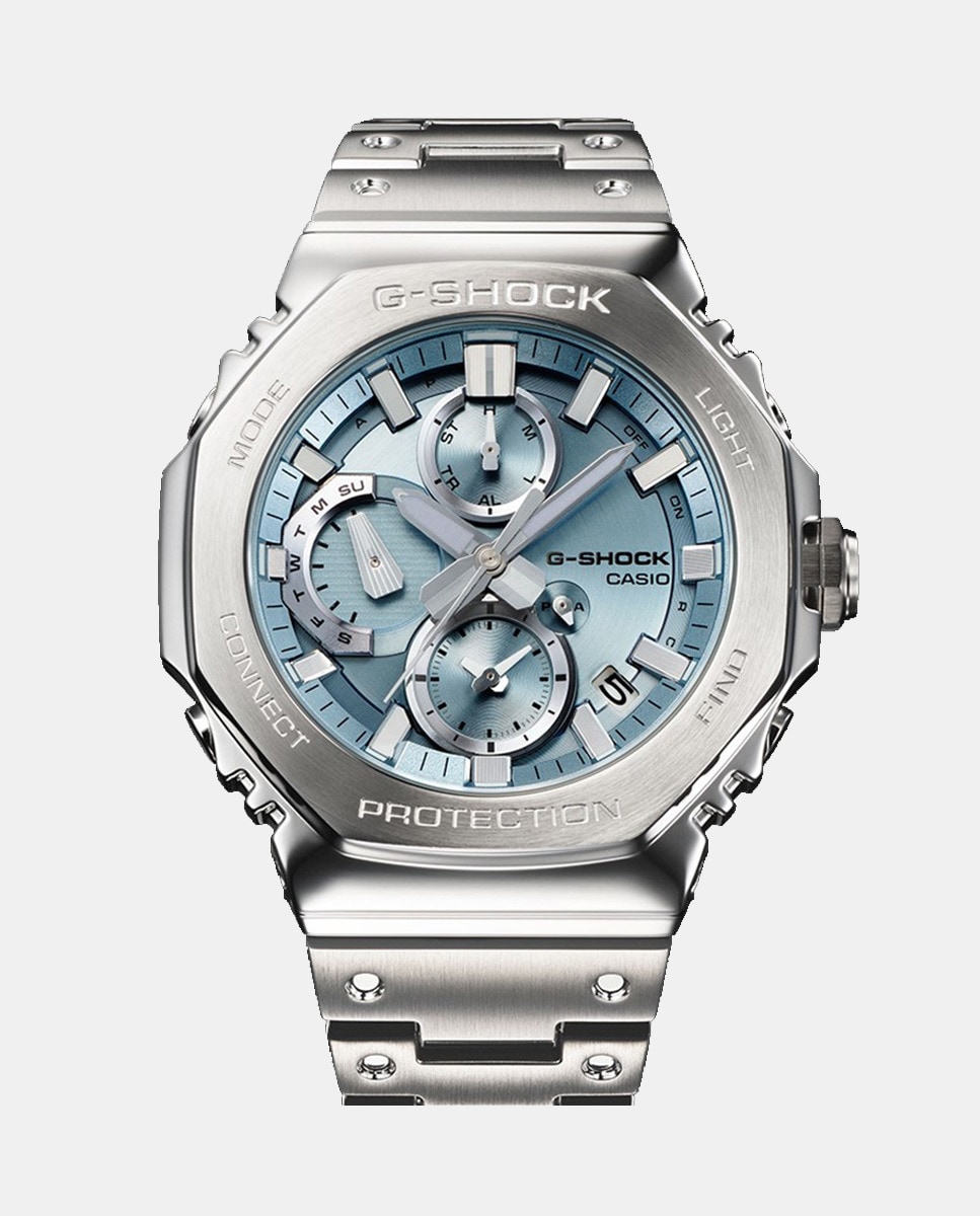 Relógio de quartzo com caixa sólida em aço inoxidável, mostrador azul claro e bracelete sólida em aço inoxidável.
