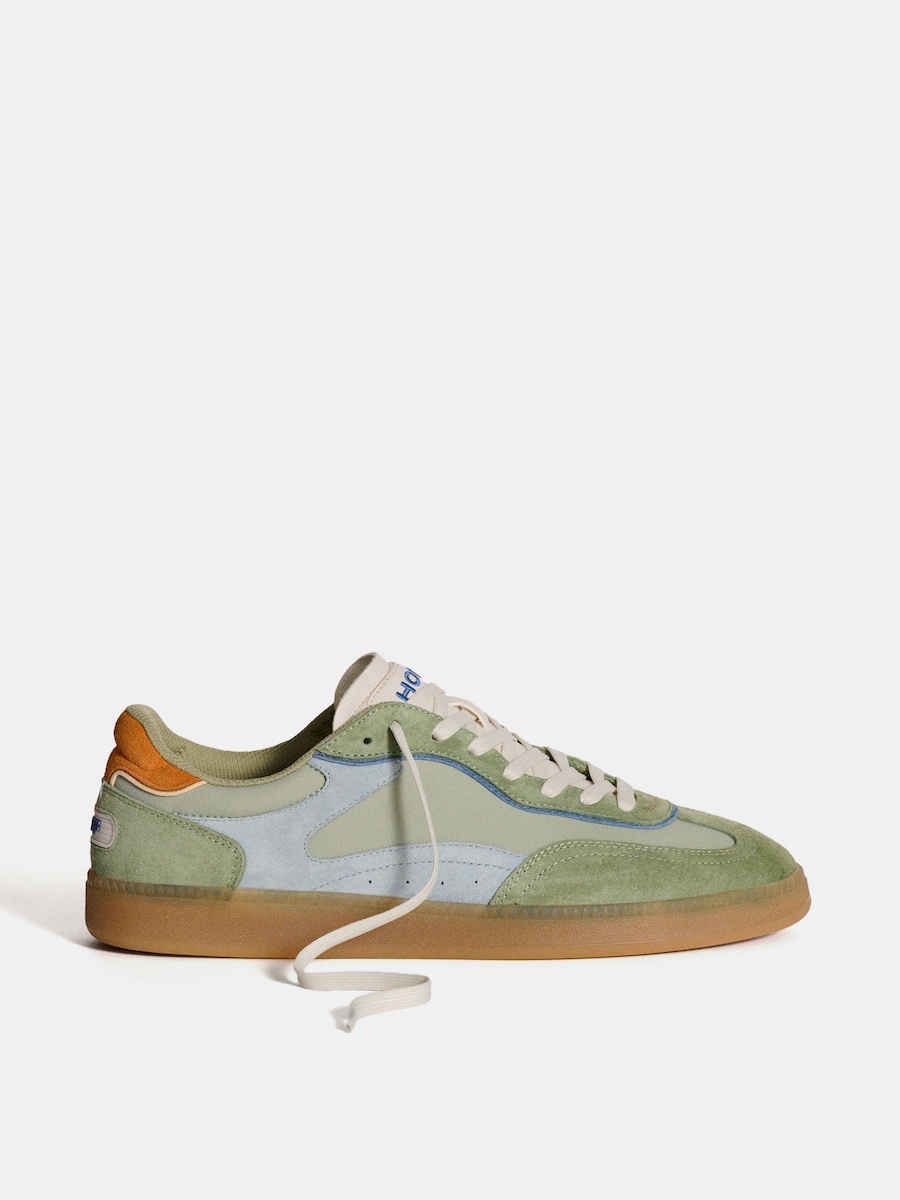 Sapatilhas de estilo casual com atacadores. Estão elaboradas numa combinação de materiais que proporcionam um acabamento suave e ligeiramente texturizado. A entressola é de borracha em caramelo, o que proporciona um bom contraste com o tom principal das sapatilhas. Na parte posterior, apresentam um detalhe em azul que adiciona um toque distintivo ao design.