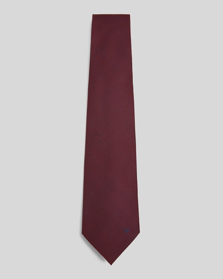 Gravata bordeaux confecionada em seda com bolinhas e raquetes bordadas em azul marinho. Apresenta forro interior azul personalizado.