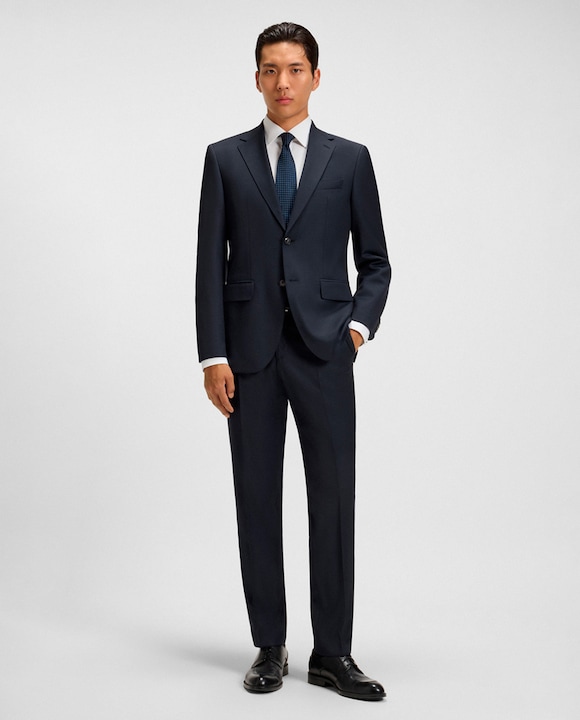 As suas linhas são descontraídas mas favorecedoras. Blazer ajustado, calças estreitas e confortáveis.