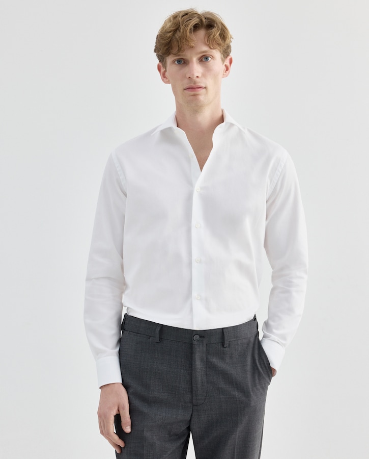 Relaxed fit estreito. Realça a figura, mantendo, ao mesmo tempo, o conforto. Gancho amplo, largura da manga que não restringe os movimentos.