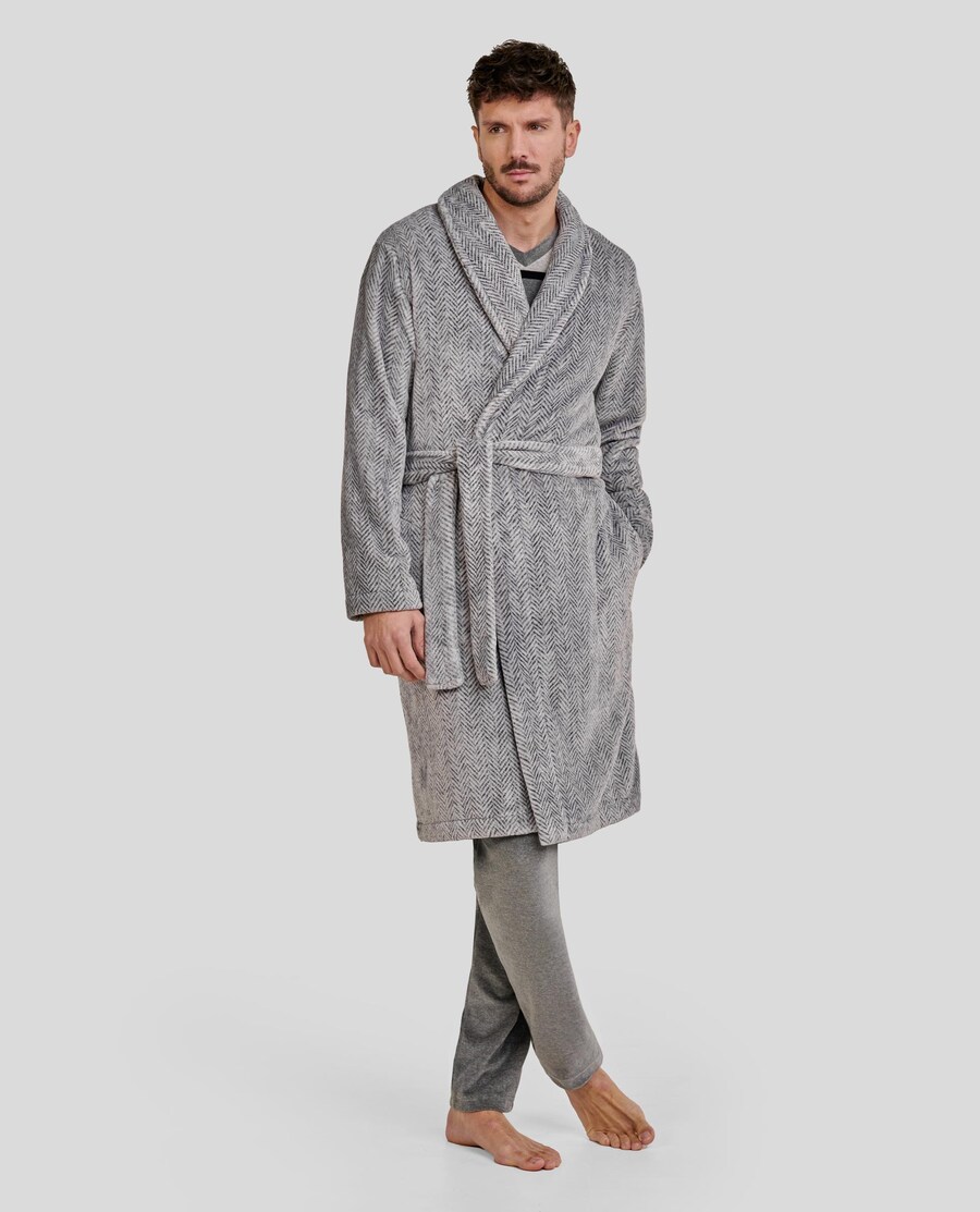 Bata Lohe de homem, tecido de espiga, gola smoking, manga comprida, bolsos laterais e cinto do mesmo tecido.