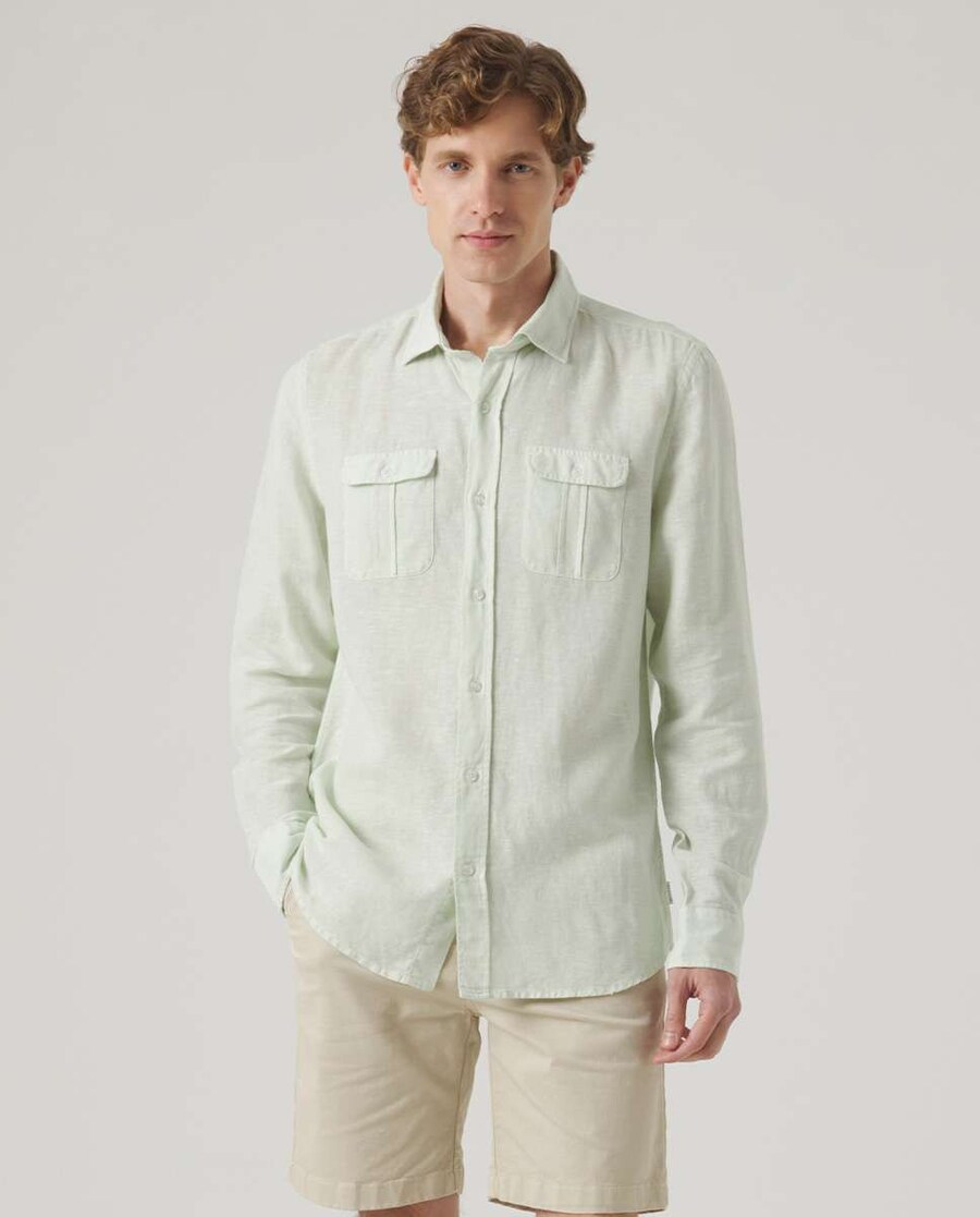 Camisa de homem com bolso, confecionada com mescla de linho e algodão de alta qualidade. Realça a figura mantendo o conforto. Cava ampla, largura da manga sem ajustar o braço e contorno ligeiramente estreito. Fabricada em Portugal.