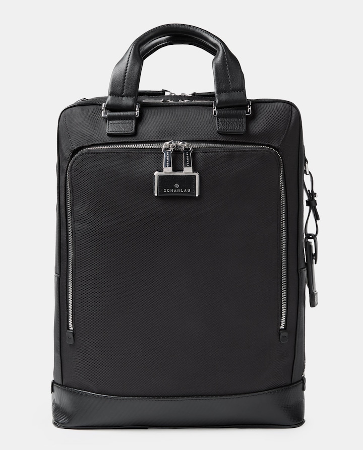 Mochila em preto fabricada em nylon balístico impermeável Cordura® 700 dtex, um tecido altamente resistente. CORDURA® é a marca líder de nylon balístico. A CORDURA® dura o dobro que o nylon convencional. É 50% mais resistente à abrasão e oferece 2,5 vezes mais proteção a rasgaduras que outros tecidos comparáveis. Também tem alguns detalhes em couro. Conta com compartimentos reforçados para o portátil de até 16", tablet e muito mais. Conta com sistema de engate a um trolley para viajar com máxima comodidade.