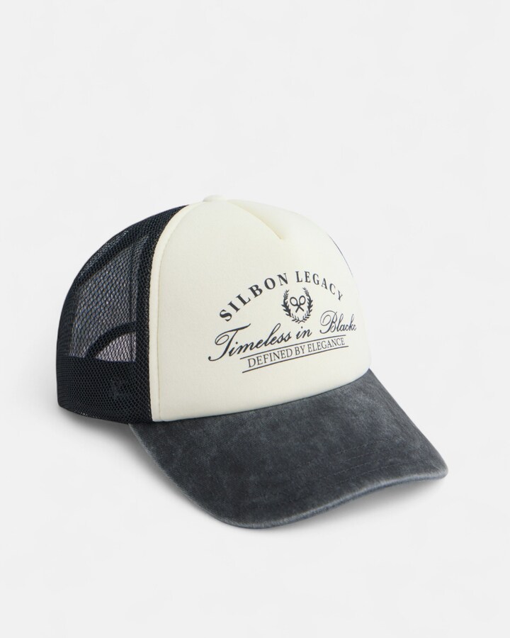 Boné de baseball trucker "Legacy black" em preto e branco confecionado em mescla de algodão. Apresenta print personalizado na coroa e aba em tecido a contrastar. Conta com ajustável e etiqueta personalizada posterior.
