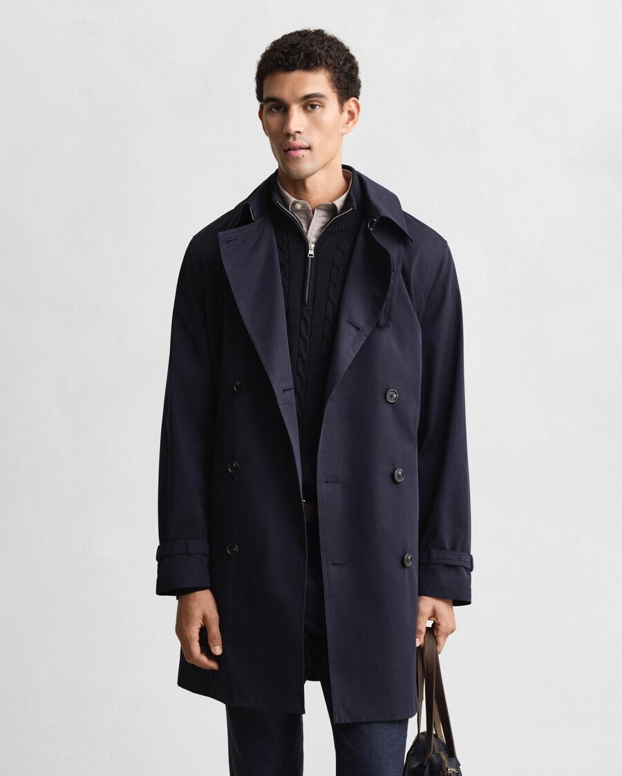 Este sobretudo clássico foi desenhado a pensar na funcionalidade e na atemporalidade. Está confecionado em mescla de algodão com um acabamento que repele a água. O seu design inclui botões duplos na parte frontal e um interior completamente forrado, além de contar com dois bolsos interiores. Possui também detalhes tradicionais, como os bolsos com friso na parte frontal, uma abertura na parte posterior, cinto do mesmo tecido, punhos ajustáveis e presilha na gola. Este sobretudo foi submetido a um tratamento Durable Water Repellent (DWR) que faz com que a peça repela a água em condições meteorológicas algo adversas.
