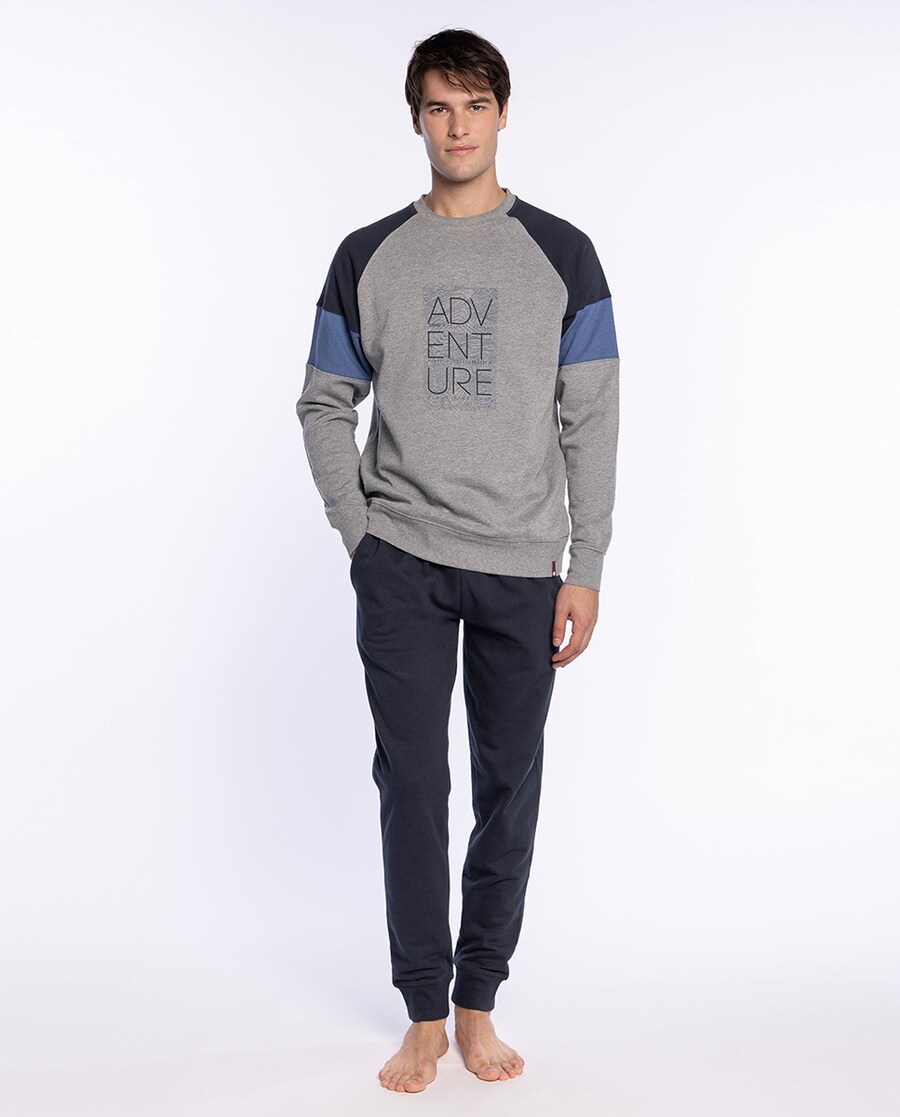 Pijama comprido em felpa perchada de algodão 100%. T-shirt com estampado posicionado, gola redonda e manga comprida com punhos. Calças compridas lisas com punho, bolsos laterais e cintura ajustável com cordão. Tecido muito suave e agradável.