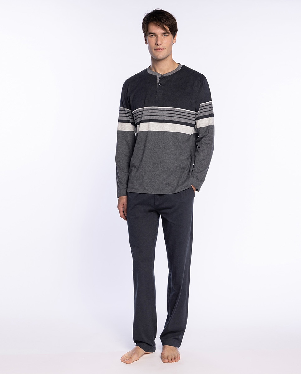 Pijama comprido de algodão 100%. T-shirt às riscas posicionadas, gola redonda aberta com botões e manga comprida, combinada com calças compridas lisas, bolsos laterais e cintura ajustável com cordão. Modelo de estilo minimalista muito confortável.