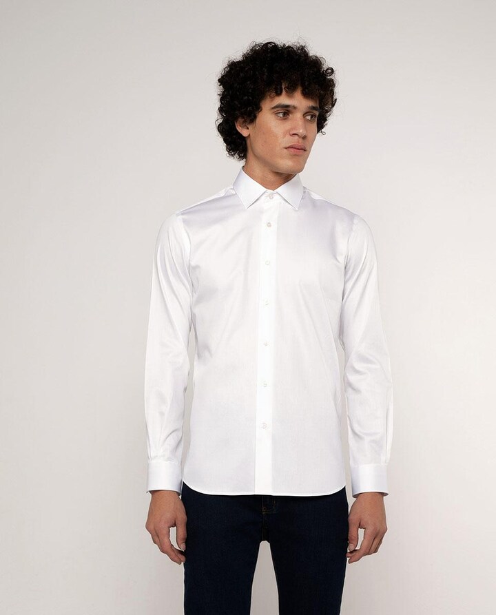 Camisa ligeiramente ajustada, gola inglesa e punhos com duplo botão para poder usá-la também com botões de punho.