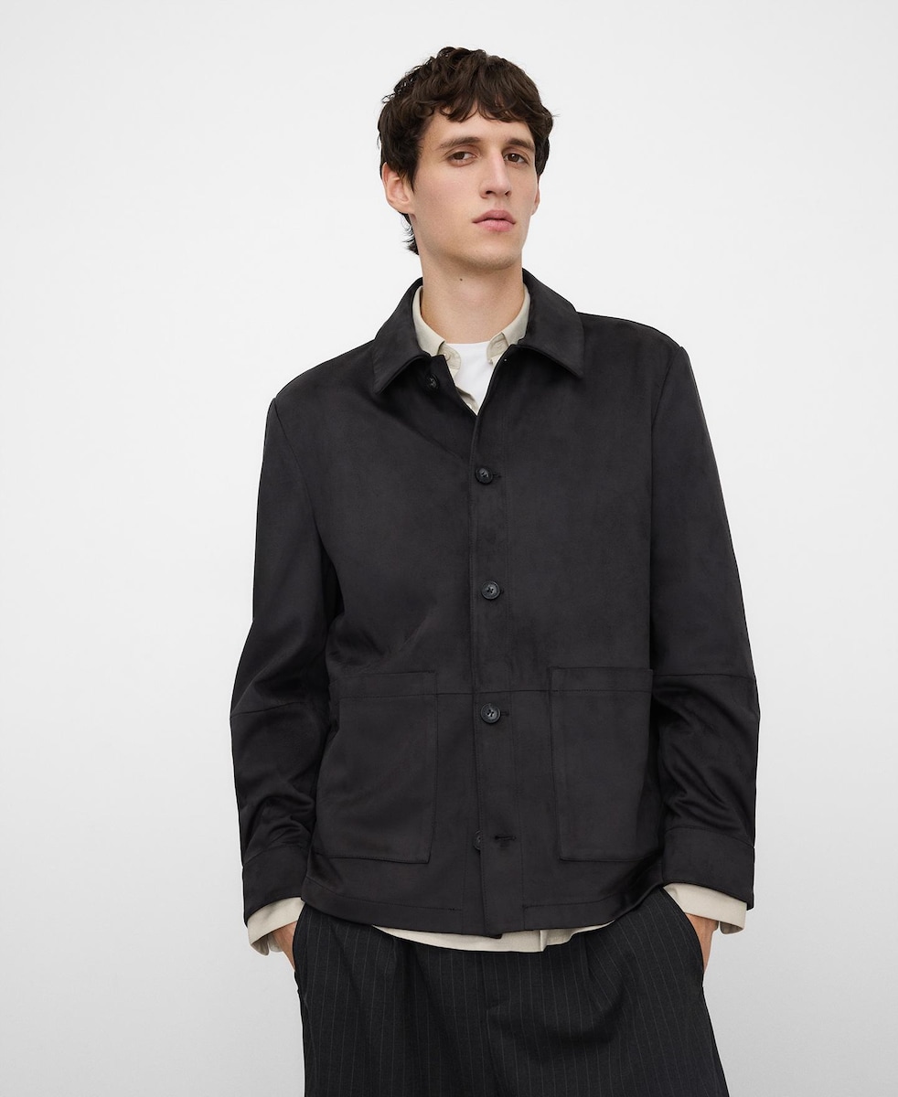 Sobrecamisa de camurcina regular fit com gola italiana. É de manga comprida com botão no punho e conta com botões frontais e bolso de plastrão na parte frontal. Possui corte horizontal na parte frontal e mangas, parte superior nas costas e etiqueta exterior com logotipo nas costas.