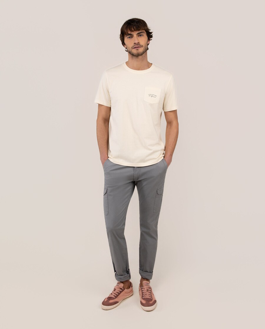 Calças cargo de homem confecionadas em estrutura de algodão. O tecido leva 2% de elastano que aporta um maior conforto e um fit mais confortável. Corte slim fit com fecho de correr e botão. Bolsos laterais. Bolsos posteriores com aba e botão. Logo bordado sobre o bolso posterior.