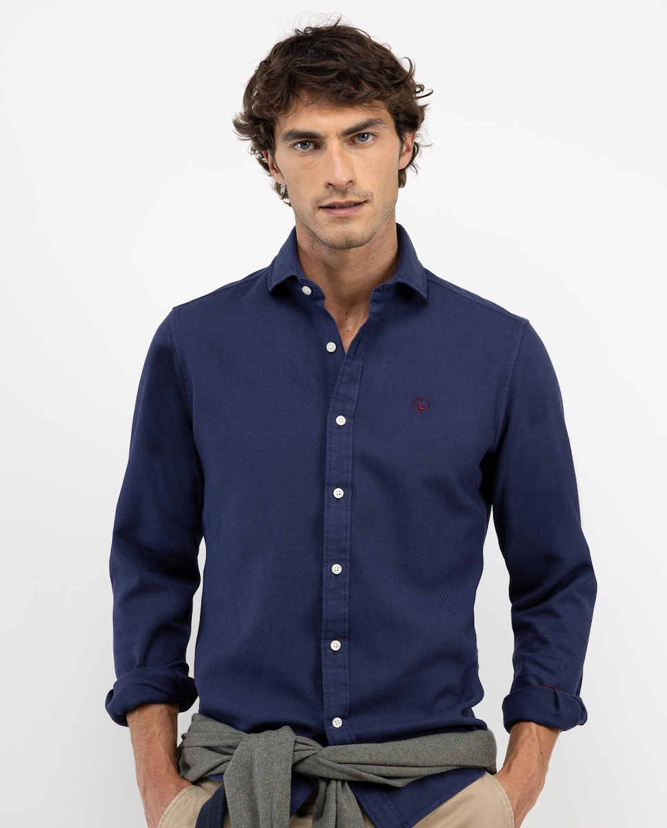 Camisa de malha lisa de homem confecionada em malha 100% algodão. Corte Regular Fit, gola italiana com baleias e fecho com botões e aba. Manga comprida terminada em punho simples e logo bordado no peito.