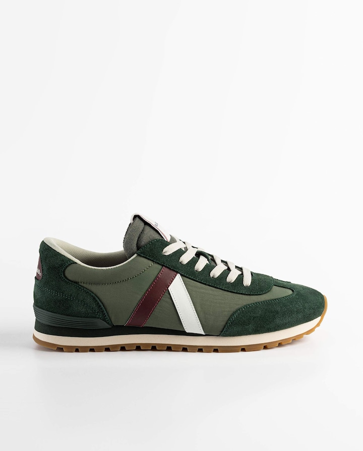Sapatilhas unisex running confecionadas em nylon. Tem biqueira e atacadores em cinza-escuro. Fecho com atacadores em cru. Sola de borracha marfim. Nossas bandas de "Walking" em pele em marinho e cru. Calcanheira de camurça com o logo bordado.