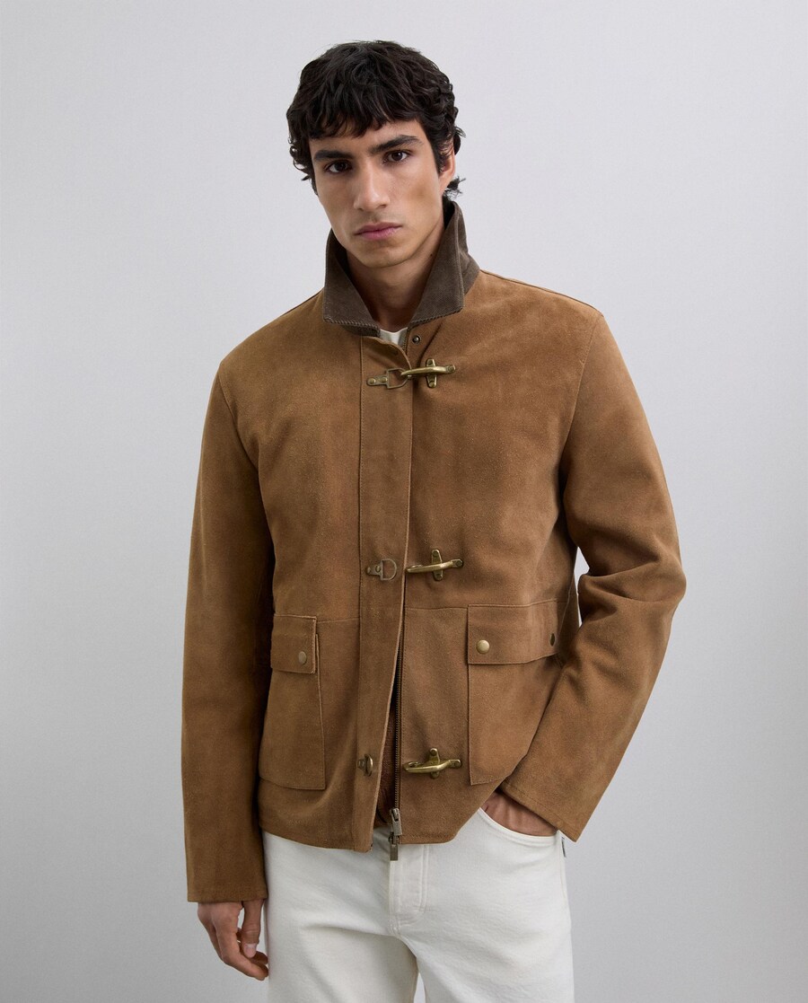 Casaco confecionado em pele de vaca 100%. Gola de bombazina em contraste. Fecho frontal com fivelas metálicas e de pele. Manga comprida. Bolsos frontais com aba e botão. Corte a direito.