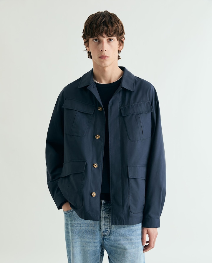 Casaco de algodão, 4 bolsos, estilo militar, com fecho de botões frontal, aba de bolsos inclinados e gola tipo camisa.