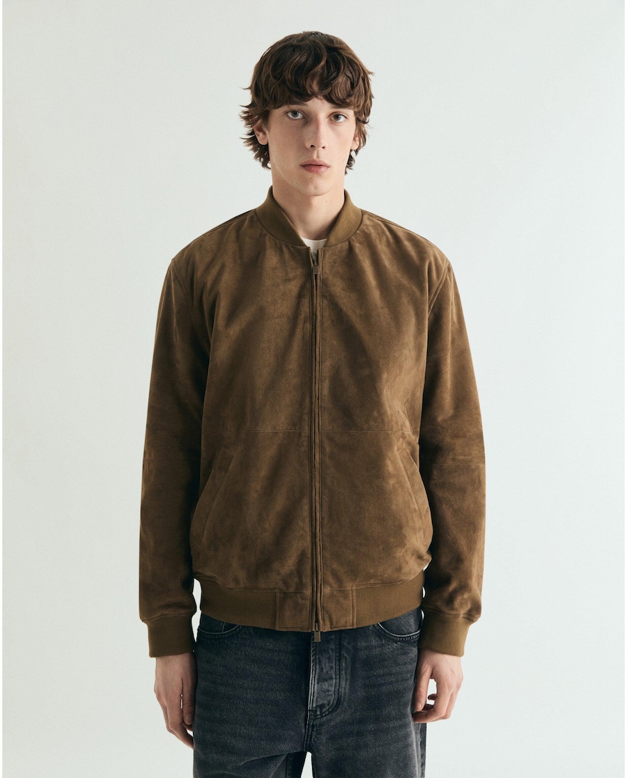 Casaco estilo bomber confecionado em 100% pele de camurça. Dois bolsos com fecho por botão de pressão. Fecho principal por fecho zip de tira dupla. Acabamentos canelados.