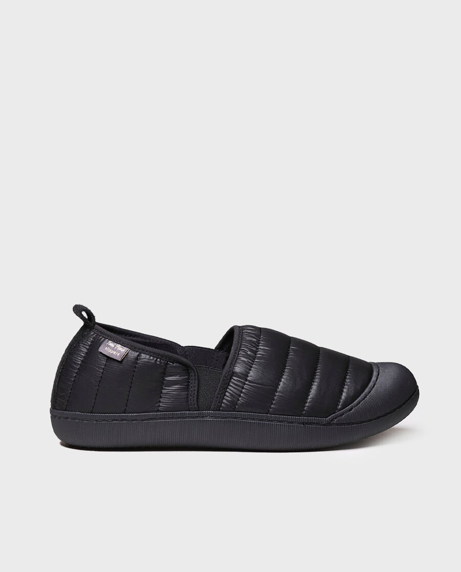 COLIN-TK. Este chinelo de casa para homem é elaborado em borracha e tecido acolchoado. A sola é de borracha antiderrapante. Conta com uma palmilha removível com cunha de 3 cm de espessura na parte do calcanhar. Os elásticos laterais fazem com que o modelo se ajuste na perfeição a cada pé. Além disso, o tecido acolchoado faz deste chinelo um design muito quente para passar o inverno. Este modelo calça o tamanho habitual, se estiver entre dois números escolha um tamanho maior. Não é aconselhável lavar os slippers na máquina. Recomendamos consultar o guia de cuidados para saber como mantê-los.
