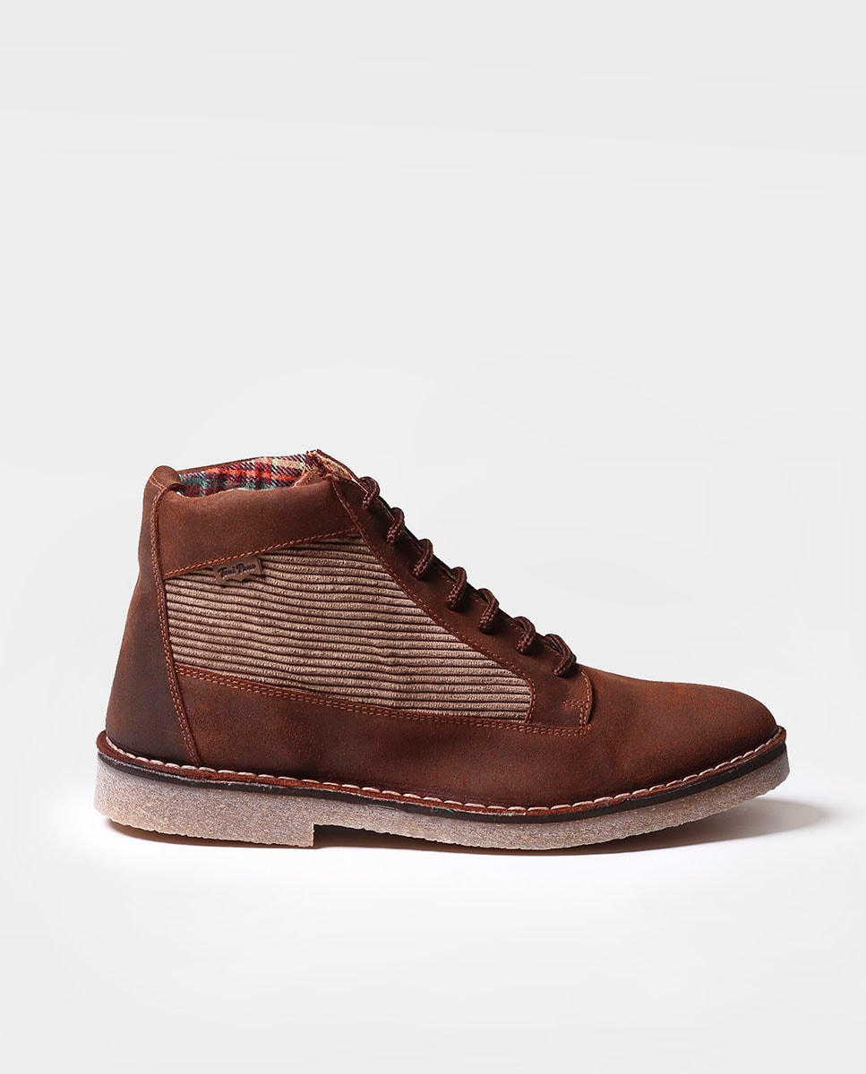 JANSEN-PN de Toni Pons. Botins para homem em camurça envernizada e tecido de bombazina. É elaborado com uma combinação de dois tons. A sola tem 3 cm de espessura, dos quais 1,5 pertencem ao tacão e 1,5 cm à sola e está feita de borracha natural. A palmilha interior está forrada para maior conforto.