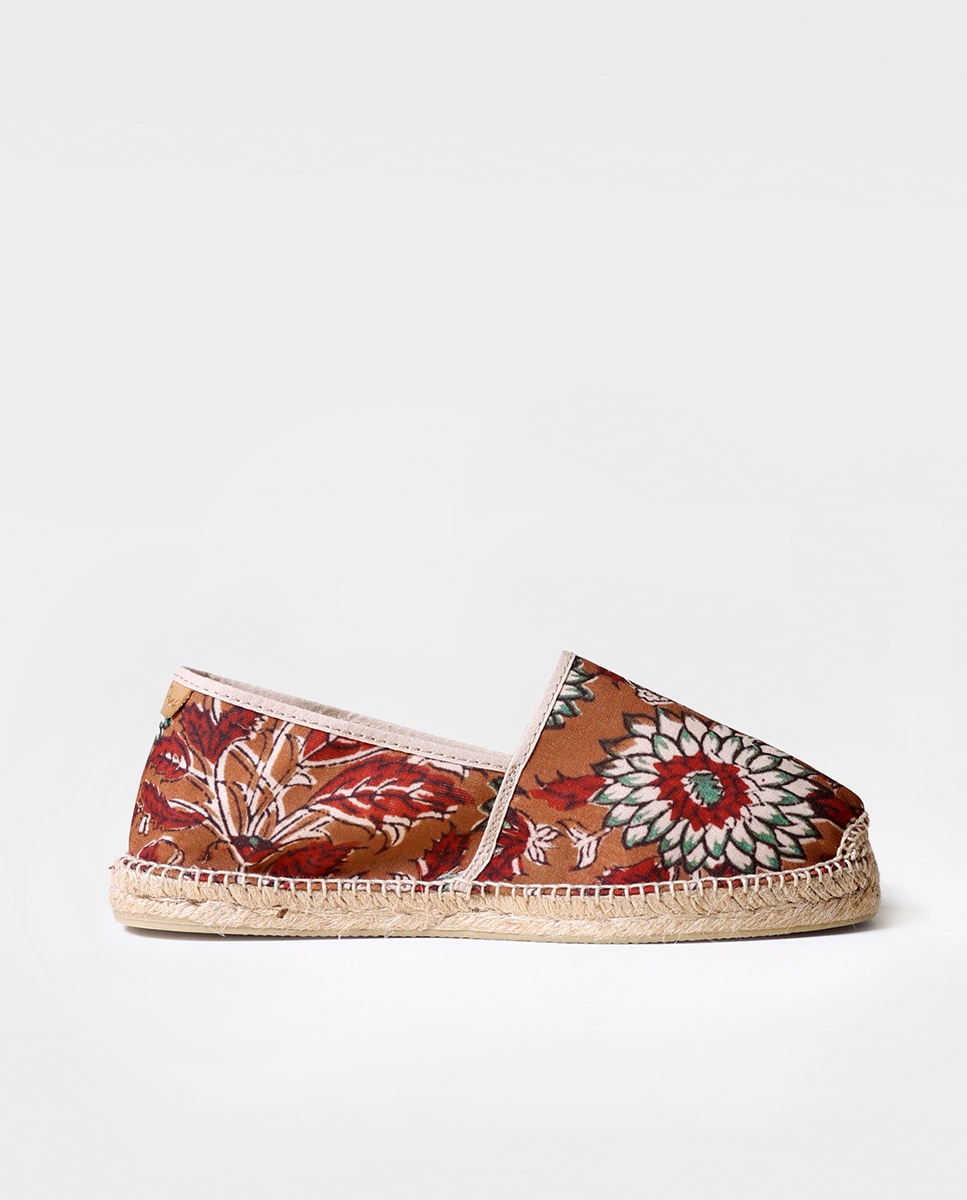JUNO. Estas alpercatas unisex estão elaboradas em estampados florais. A sola é de juta e a base de borracha antiderrapante. A união do tecido e da sola está cosida à mão com um fio de algodão e tem um reforço na ponta para maior sustentação. É um modelo 100% vegano. Este modelo calça o tamanho habitual, se está entre dois tamanhos recomendamos escolher o maior.