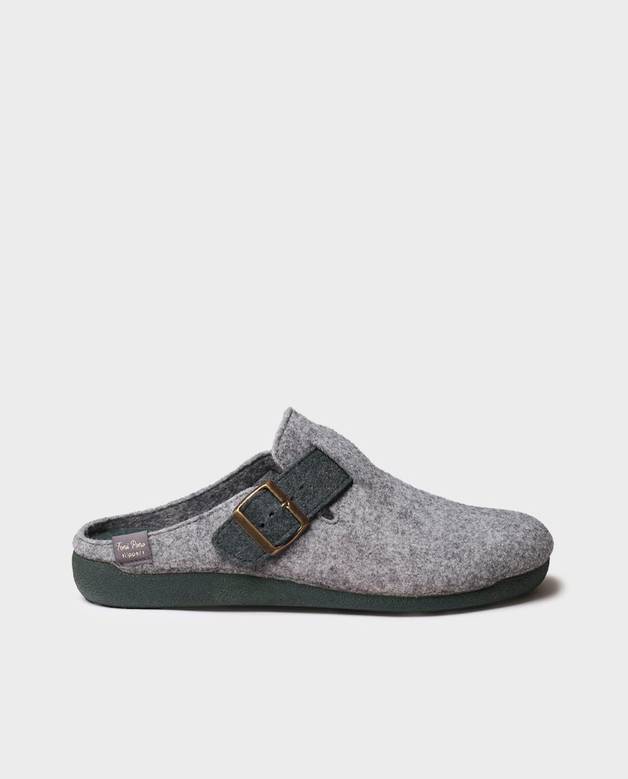 NORTON-FR. Este chinelo de casa tipo socas para homem está confecionado em feltro reciclado. Conta com uma fivela regulável para poder ajustar este slipper. Um modelo muito confortável que te acompanhará todo o inverno. A sola, a palmilha e a tira ajustável estão feitas em uma cor contrastante. A sola é de borracha antiderrapante e tem 3 cm de espessura. Este modelo calça o número habitual, se estás entre dois números, escolhe um número maior.