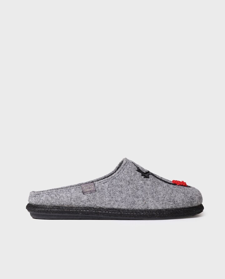 TOBI-DR. Estas pantufas abertas para homem estão feitas em feltro com motivos natalícios bordados. A sola é plana e tem 1 cm de espessura e está feita de borracha antiderrapante e trança de juta. Conta com uma palmilha removível com uma cunha de 2 cm na parte do calcanhar. Este modelo calça o tamanho habitual; se estiver entre dois números escolha um tamanho mais pequeno. Não é aconselhável lavar as slippers na máquina de lavar. Recomendamos consultar o guia de cuidados para saber como mantê-las.