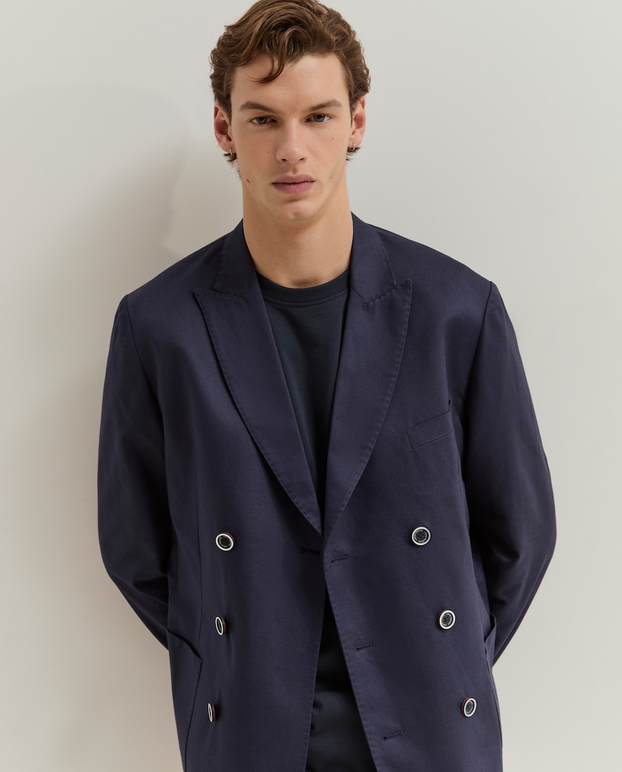 Blazer de trespasse com abotoadura dupla em botões com contraste. Uma versão contemporânea do blazer que se adequa na perfeição a looks de dia-a-dia mas também a outras ocasiões especiais. O seu design apresenta dois grandes bolsos de chapa e outro mais pequeno no peito. Finaliza ainda com dois bolsos interiores e duas aberturas nas costas. É confecionado com uma mistura de algodão e linho, que combina o melhor de dois mundos: o conforto e a leveza. O algodão proporciona suavidade e um toque macio, enquanto o linho confere uma respirabilidade natural e um aspeto texturizado.