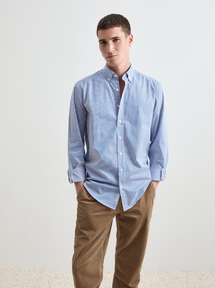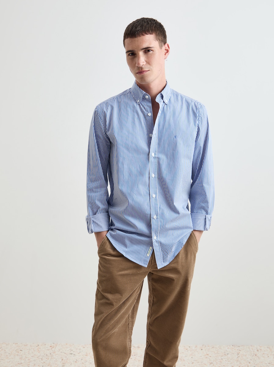 Para um look elegante, mas suficientemente descontraído, sugerimos esta camisa com padrão de riscas verticais. De corte regular fit, é confecionada em popelina de algodão, pré-lavado e com acabamento macio. Aperta com botões na frente, colarinho e punhos e finaliza com bordado da marca a contraste no peito.
