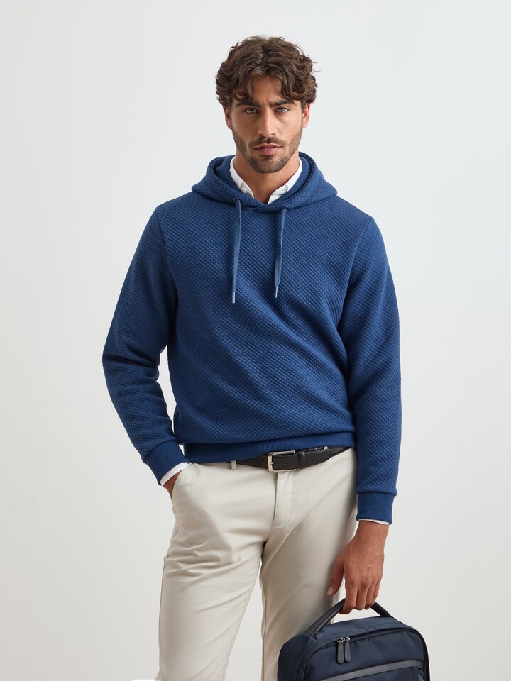 Moderna e confortável, esta sweater com capuz em malha texturizada é perfeita para um look descontraído. Versátil e prática, combina facilmente com jeans ou calças casuais, garantindo estilo no dia a dia.