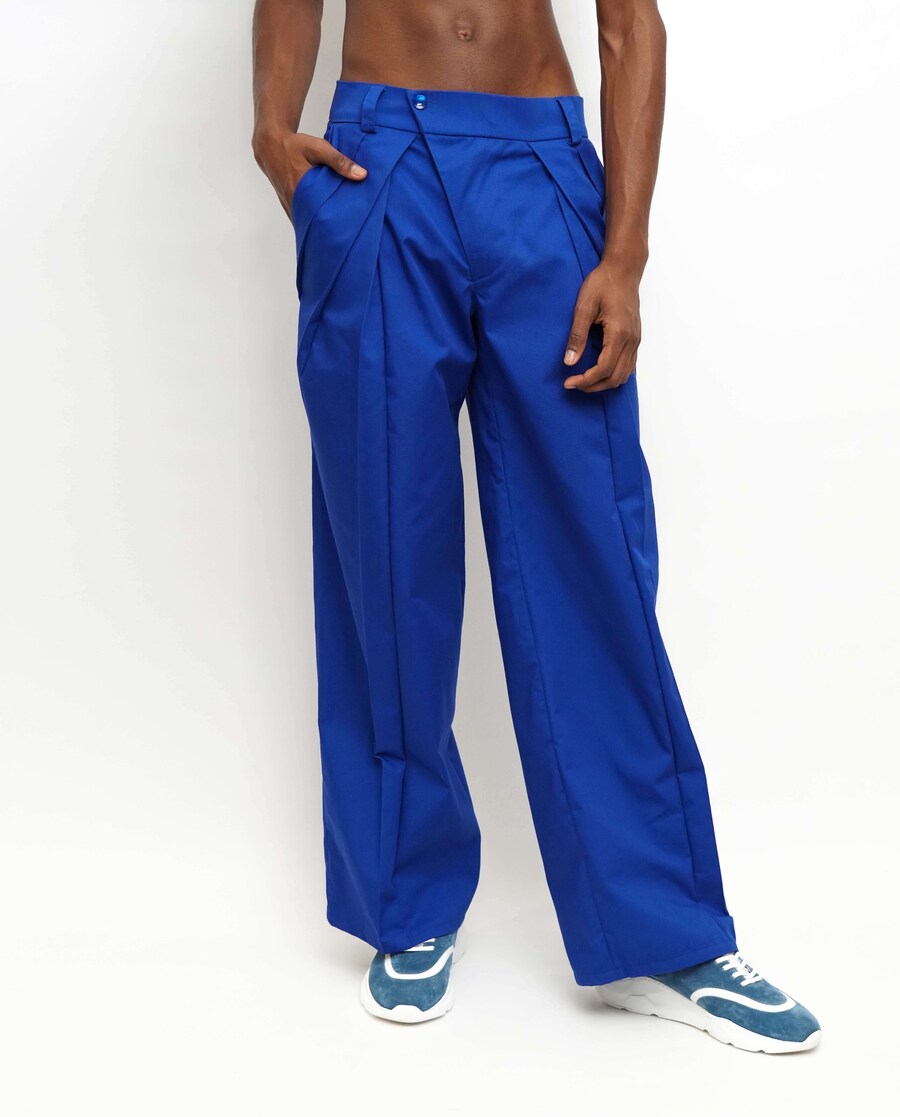 Calças em algodão assimétricas com pregas sobrepostas e perna larga.Fabricado em Portugal