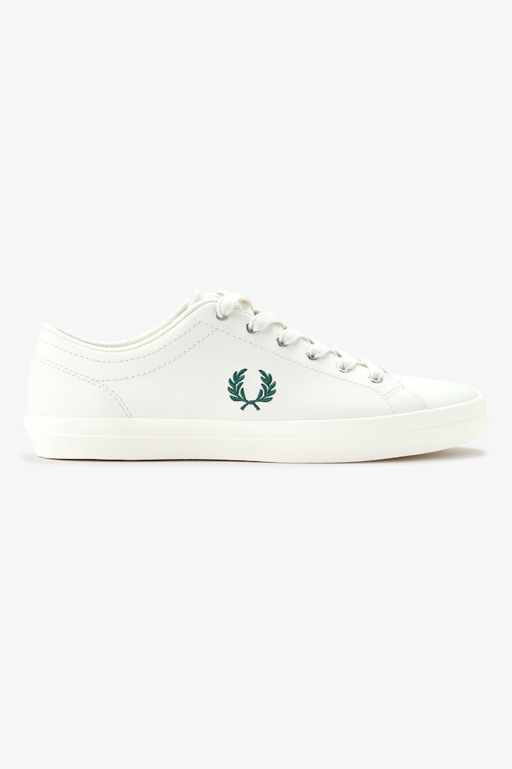 Sapatilhas em pele macia, sola de borracha e coroa de louros bordada no painel lateral.
