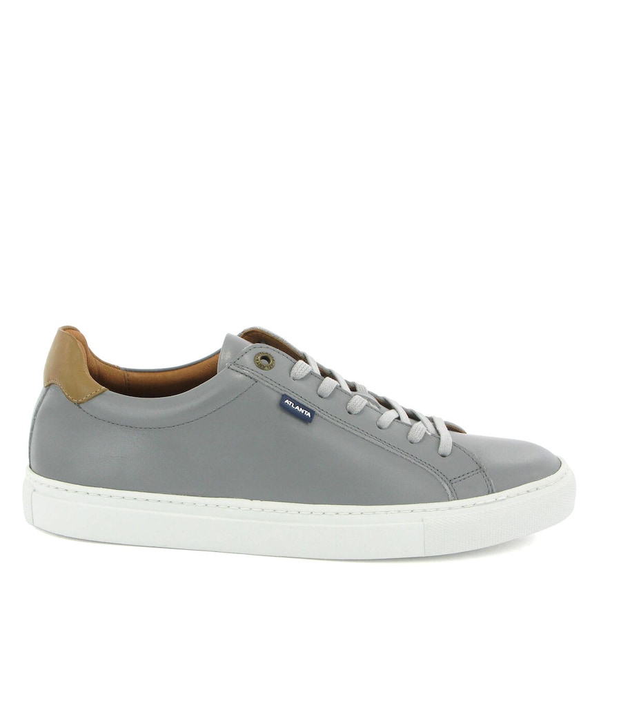 Sapatilhas em pele cinza com forro em pele e sola branca de borracha. Enviados com saco de pano de viagem. Fabricados em Portugal.