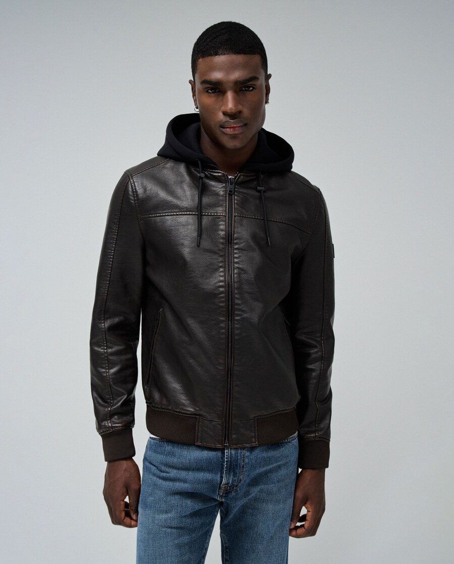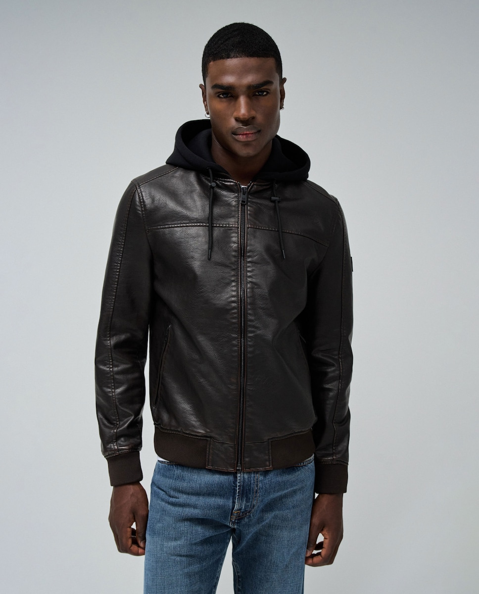 Esta blusão bomber com efeito de pele é perfeita para um look moderno e atrevido. Com uma abertura frontal com fecho zip e capuz destacável para maior versatilidade. A gola com cordão e os punhos elásticos garantem conforto e um ajuste perfeito. O corte regular torna-o numa peça essencial para combinar com qualquer estilo. - Blusão Bomber - Efeito Pele - Abertura frontal com fecho zip - Capuz destacável - Gola com cordão - Corte regular - Mangas compridas com punhos elásticos Para referência, a modelo mede 1,90 m e usa o tamanho L.
