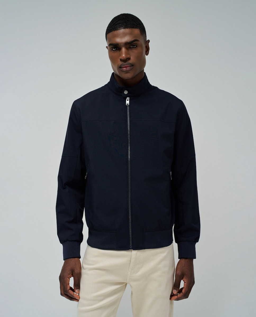 Casaco Bomber. Abertura frontal com fecho de correr e botão de pressão. Corte regular. Dois bolsos laterais e bolso interior com fecho de correr. Mangas compridas com punhos elásticos.
