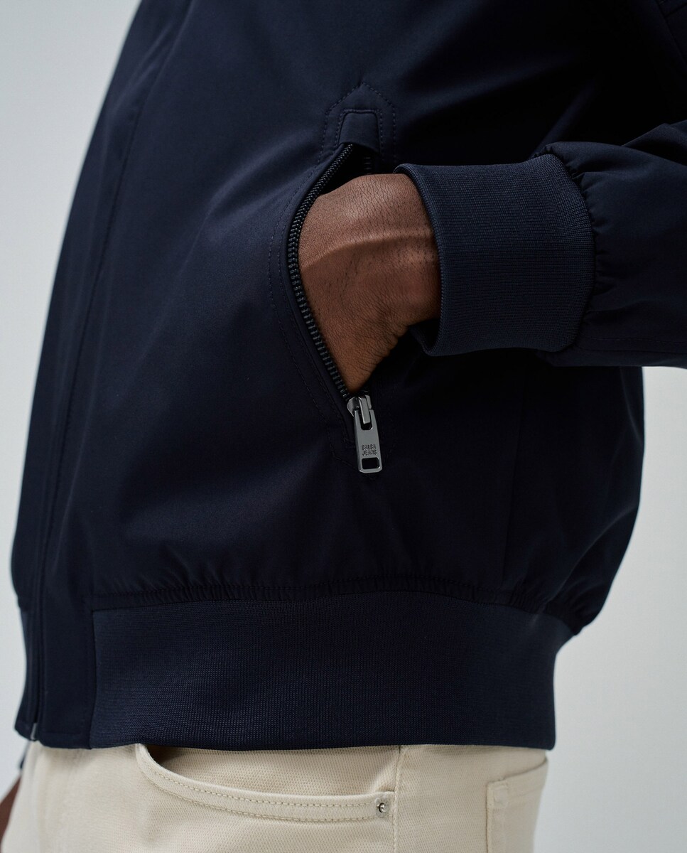 Casaco Bomber. Abertura frontal com fecho de correr e botão de pressão. Corte regular. Dois bolsos laterais e bolso interior com fecho de correr. Mangas compridas com punhos elásticos.
