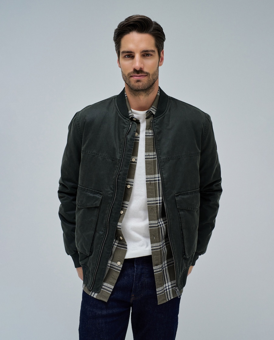 Esta bomber, em verde lavado, apresenta um corte regular que garante conforto e estilo. Com mangas compridas e punhos e cintura canelados, oferece um ajuste perfeito e relax. A abertura com fecho zip assegura praticidade, enquanto que os dois bolsos frontais e um interior adicionam funcionalidade ao design intemporal. Bomber. Corte regular. Mangas compridas. Punhos e cintura canelados. Abertura com fecho zip. Dois bolsos frontais e um interior. Para referência, o modelo mede 1,87 m e leva um tamanho L.