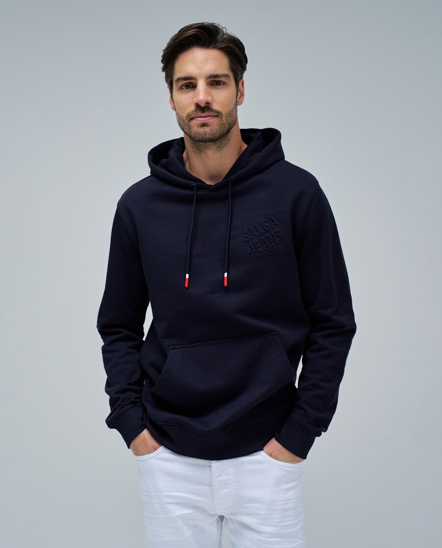 Sweatshirt em azul, confecionada em tecido suave e confortável. Tem capuz ajustável com cordões, mangas compridas com punhos canelados e bolso frontal estilo canguru. O design destaca-se pelo branding em relevo, adicionando um toque moderno e sofisticado. Ideal para um look casual e versátil.- Sweatshirt com branding em relevo- Azul- Capuz com cordões- Corte regular- Mangas compridas com punhos canelados- Bolso frontal Para referência, o modelo mede 1,87m e está usando o tamanho L.