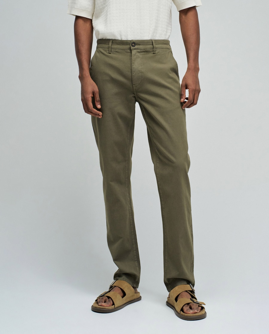 Estes calças chino são a opção ideal para quem procura conforto e estilo durante todo o dia. A perna slim proporciona um corte clássico e elegante, enquanto o cós médio assegura um ajuste perfeito e confortável. Com quatro bolsos para maior funcionalidade, estas calças são a escolha perfeita para um look casual e moderno.- Calças Chino- Cós médio - Perna slim- Quatro bolsos- Com presilhas- Abertura com fecho zip e botão.