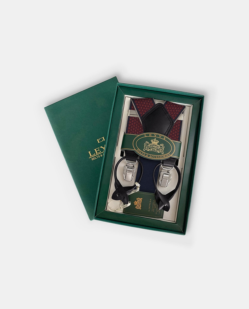 Suspensórios elásticos azuis com pontilhado de jacquard vermelho-branco