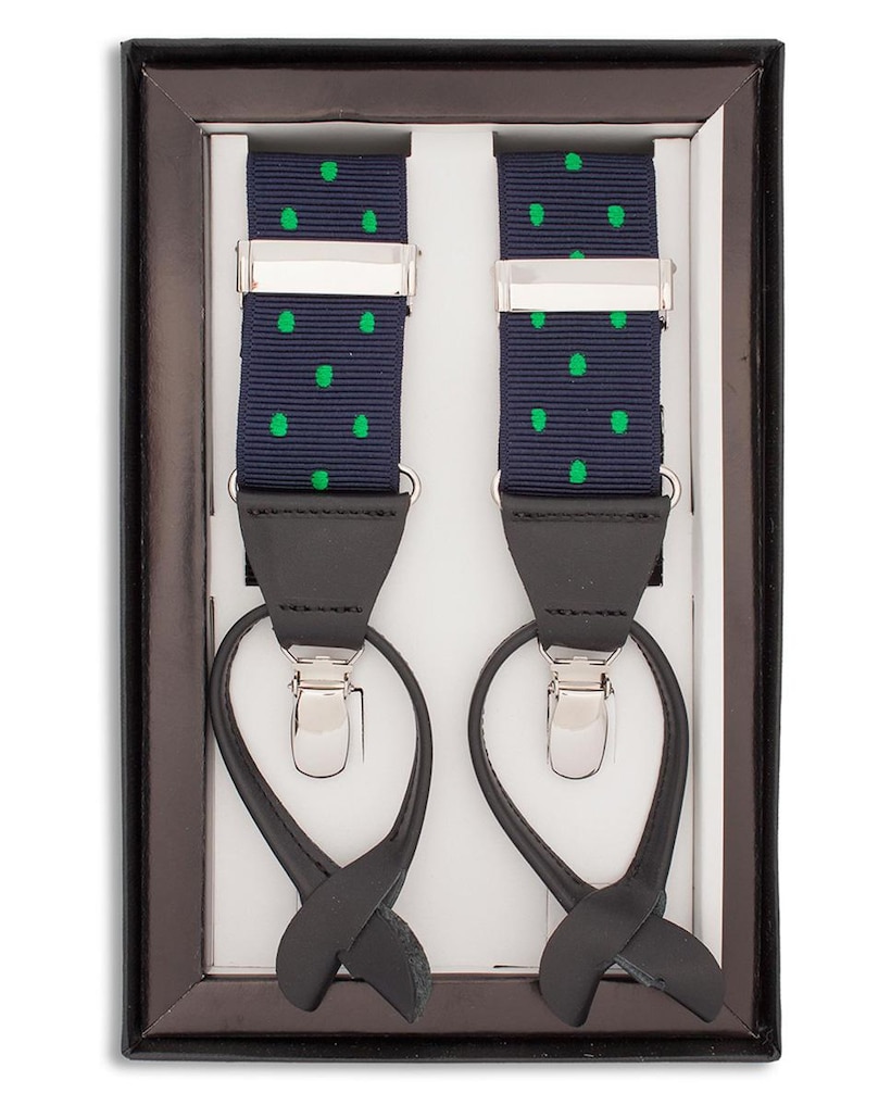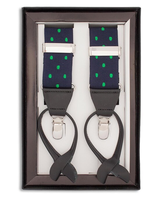 Suspensórios elásticos azul-marinho com estampado de micro bolinhas. Fabricado em Espanha.