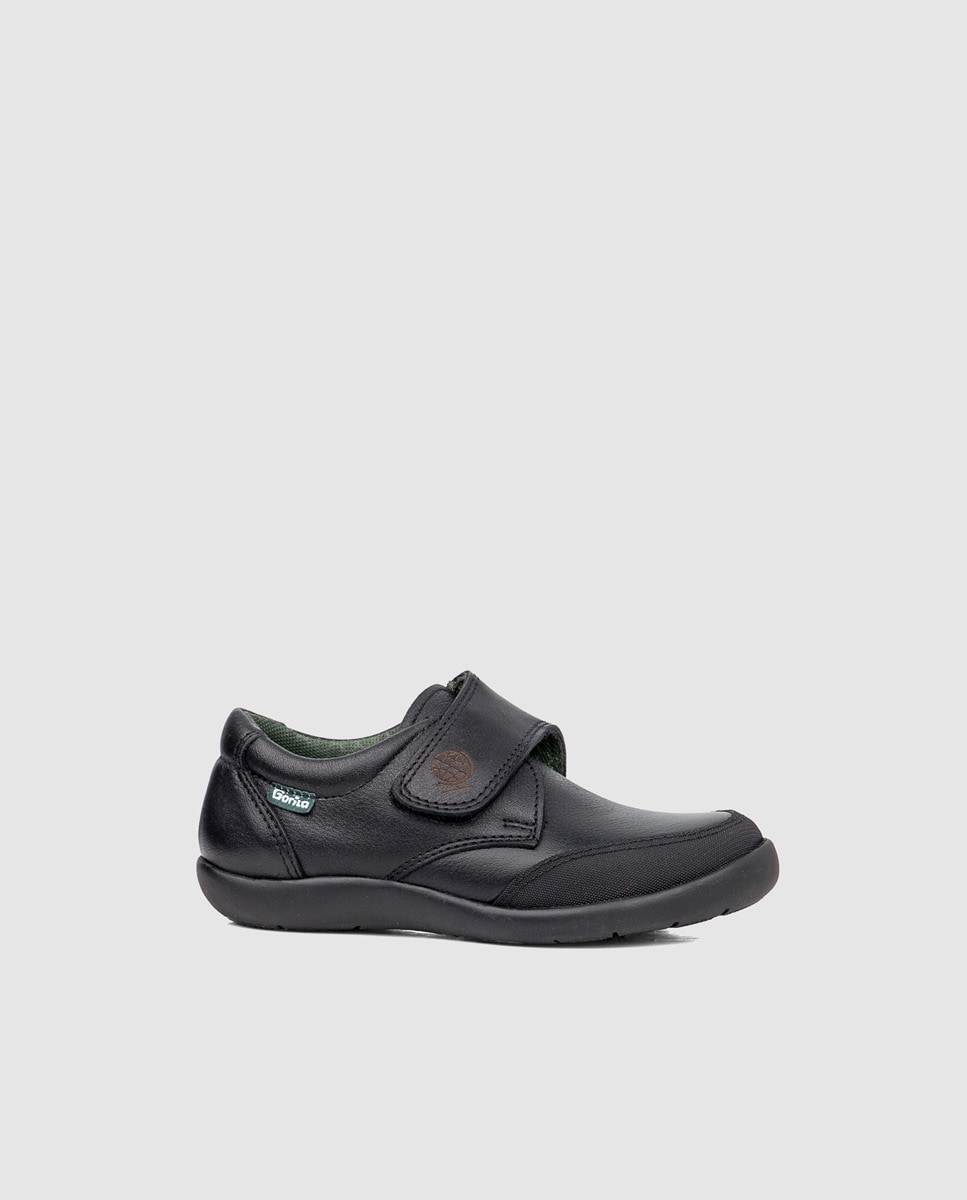 Sapatos escolares com fecho de velcro, fabricado em pele bovina com biqueira reforçada.