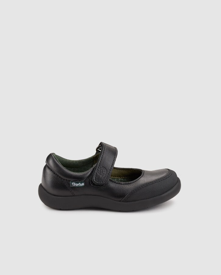 Sapatos escolares de presilha com fecho de velcro em pele bovina e biqueira reforçada. Sola de borracha com tecnologia de adaptação.