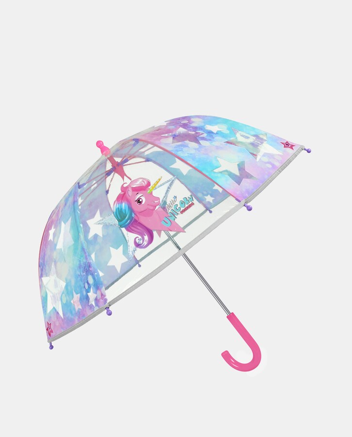 Guarda-chuva manual com cúpula transparente e print de unicórnio. Com sistema antivento e abertura de segurança. Tem varetas em fibra de vidro e detalhes refletores.
