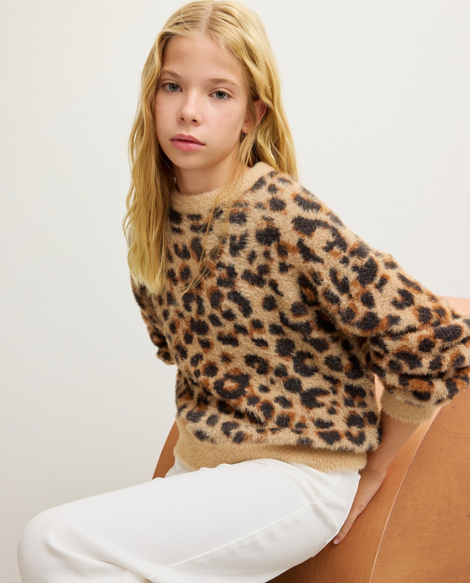 Camisola de Malha com Pelo e Intársia de Leopardo
