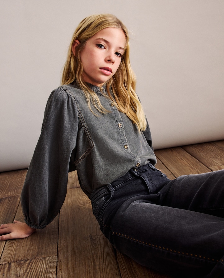 Blusa em Tecido de Ganga com volume e Manga Comprida