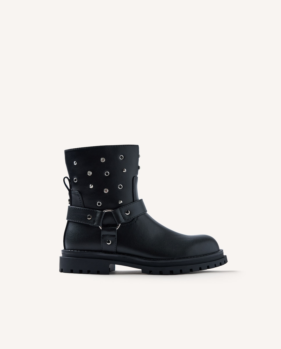 Botas suaves ao toque com tachas, ilhós e pedraria. Contam com palmilha acolchoada e detalhe de estribo no cano. Corte de poliuretano. Forro de poliuretano e nylon. Palmilha de poliuretano. Sola de TPR flexível.